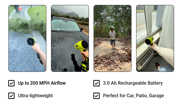 This blower is a game-changer! I use it in my garage and patio, and it handles leaves and debris like nothing I've used before. Super lightweight and powerful airflow—definitely feels like 200 mph. Battery lasts longer than expected.