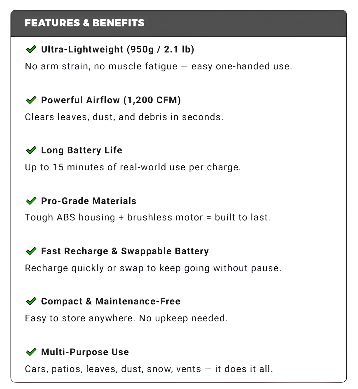 Lightweight design makes it easy to use even for longer periods. Perfect for quick cleanups on the patio or around the car. The airflow is impressively strong, and I appreciate the cordless freedom the battery provides. Works better than my old gas-powered model and charges quickly between uses. A must-have tool for any homeowner looking for convenience and performance.
